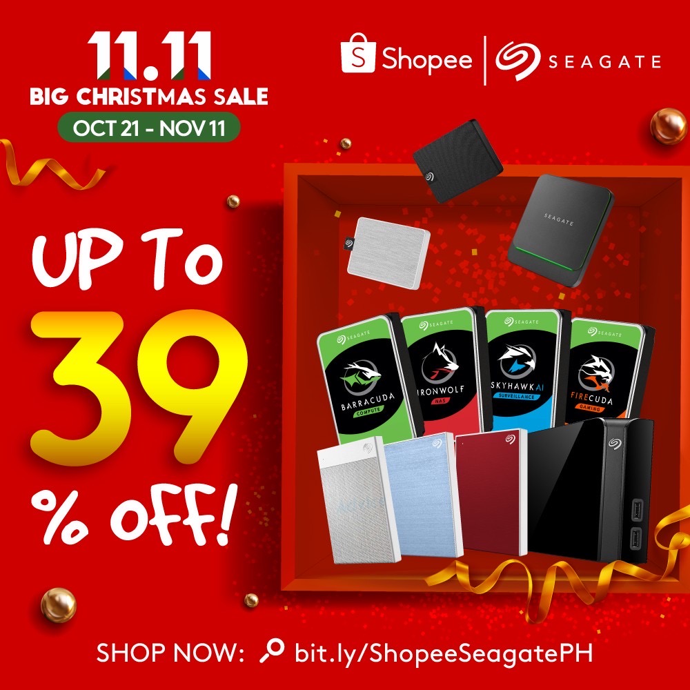Seagate Technology plc (NASDAQ: STX), a world leader in storage solutions, is teaming up with Shopee for an amazing 11.11 Big Christmas Sale happening from Oct 21 to Nov 11, 2020, offering 39% off products from its popular line of storage for backup, gaming, and NAS. A few noteable storage drives on promotions include Backup Plus Slim 2TB, Backup Plus Hub 10TB, and IronWolf 4TB. Shopee users can also look forward to Shopee Live happening on Nov 9, 2020 at 3:00PM to know more about Seagate’s IronWolf & Synology Specialised Big Bundle Promotion and Flash Sale schedule. Visit the Seagate official store on Shopee at http://bit.ly/ShopeeXSeagatePH For more information on the Shopee 11.11 Big Christmas Sale, please visit https://shopee.ph/11-11 Download the Shopee app for free via the App Store or Google Play.
