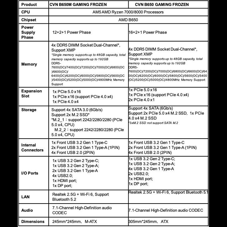 Colorful Technology Company Limited, a leading brand in gaming PC components, gaming laptops, and HiFi audio products, proudly presents the CVN B650M GAMING FROZEN motherboard. This motherboard is our first AMD AM5 motherboard that supports the AMD Ryzen 7000 Series and the latest AMD Ryzen 8000 Series processors that feature the groundbreaking AMD Ryzen AI technology as well as support for AVX-512.