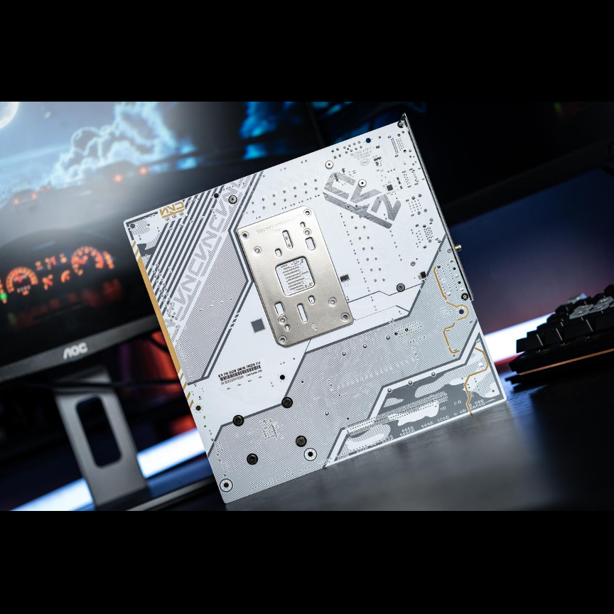 The CVN B650M FROZEN WIFI sports the signature military inspired white on silver camo style design which extends to the back of the motherboard. The RGB LED-lit CVN logo on the upper-right of the motherboard completes the gaming look of the motherboard which can be synchronized with other RGB components using the iGame Center app.