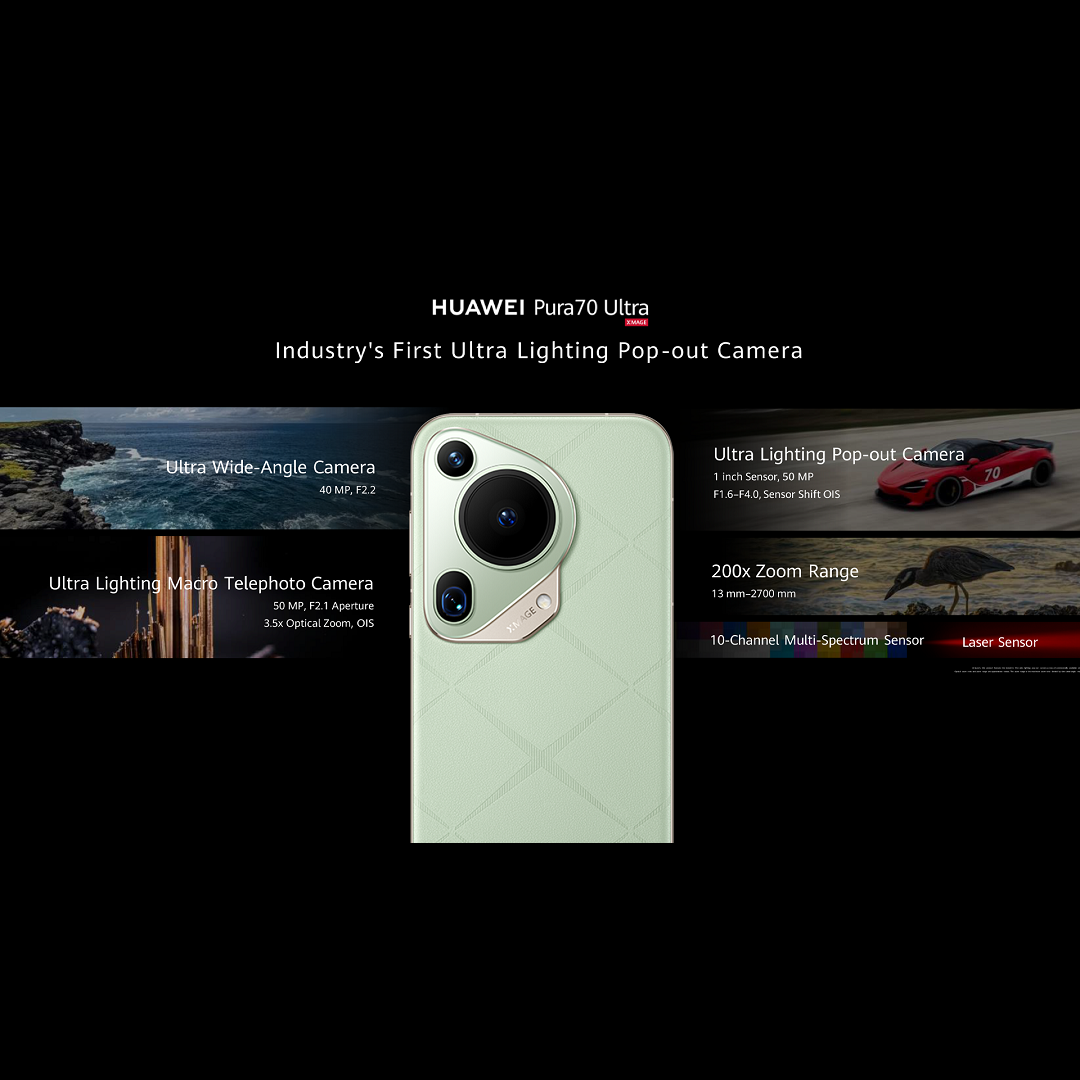 At the forefront of innovation, the HUAWEI Pura 70 Ultra introduces groundbreaking camera features that redefine mobile photography. Its standout feature is the industry's first ultra-lighting pop-out camera, which offers unmatched flexibility, control, and creativity in capturing every shot. Moreover, the Pura 70 Ultra boasts a 40MP ultra-wide-angle camera, an ultra-lighting macro telephoto camera, a 200x zoom range, and a 10-channel multi-spectrum sensor. With these advanced specifications, the Pura 70 Ultra effectively empowers users to push the boundaries of mobile photography like never before.