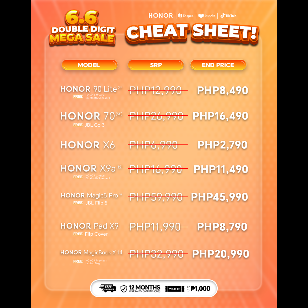 Second on the 6.6 HONOR Mega deals is the HONOR 70 5G with a ₱10,000 discount accompanied by FREE JBL Go 3 upon purchase. It is the Best Buy Smartphone 2022-2023 of Eisa Award for its quality and price point. For more deals, the following cheat sheet shows the freebies and discounts.