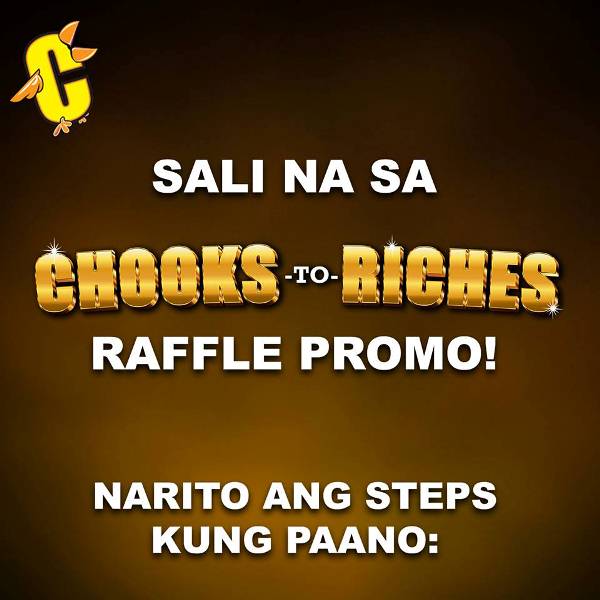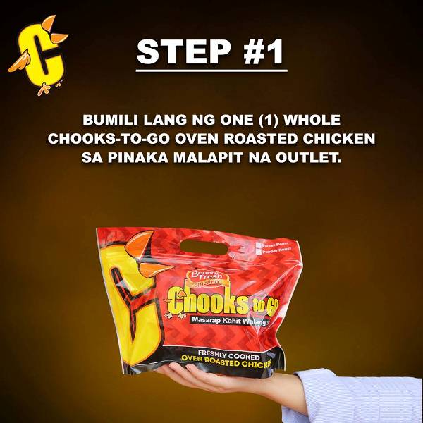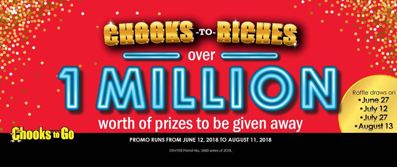 Chooks-to-Riches is giving twelve (12) winners a chance to take home PhP 100,000 in cash prizes, tax-free. To qualify for the promo, customers must make a single receipt purchase of at least one (1) whole Chooks-to-Go oven roasted chicken of any variant (Sweet Roast, Pepper Roast, Fried Chooks).