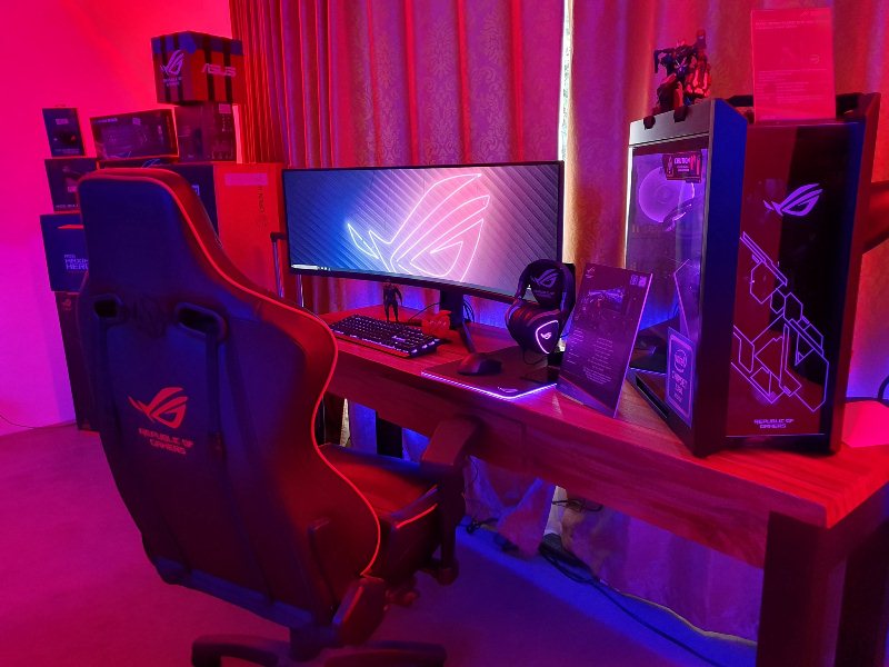The gaming cave is the centerpiece of the room, powered by a full ROG DIY PC lineup, ranging from the ROG Maximus XI Formula motherboard, Strix RTX 2080Ti, ROG Ryujin 240, ROG Thor 1200P, Strix XG49VQ, Strix Scope, Gladius II Wireless, Balteus Qi, and Strix Helios.