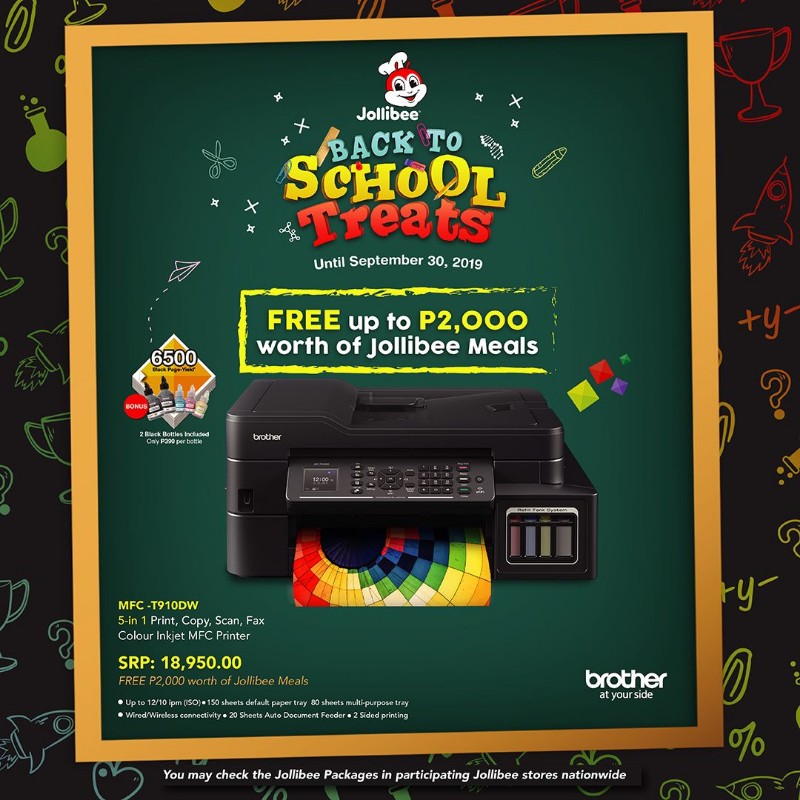 Yes, Brother's Back to School Treat Promo returns, thanks to popular demand! For every purchase of a Brother Refill Tank System printer, customers can get some of their favorite Jollibee meals. Running until September 30, 2019, customers who purchase any of the participating printer models Brother DCP-T310, DCP-T510W, DCP-T710W, MFC-T810W, and MFC-T910DW Color Inkjet Printers will be eligible for up to PhP 2,000 worth of Jollibee treats.