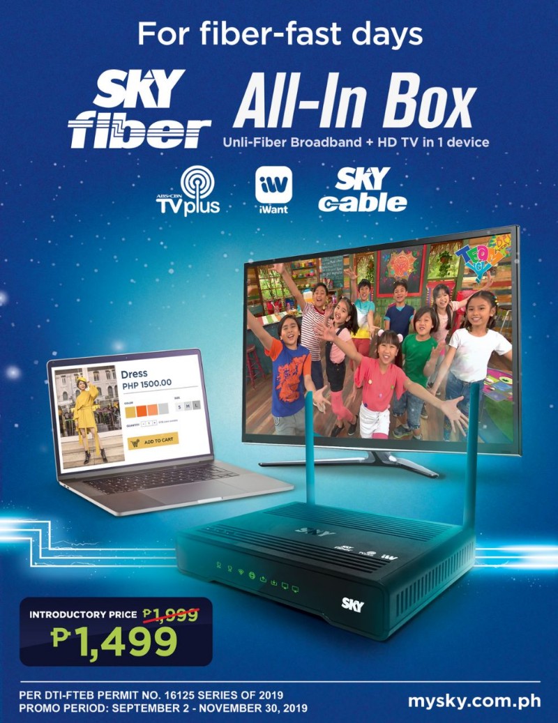 SKY Fiber’s All-In Box is available for a special introductory installation fee of PhP 1,499. It is initially available in Metro Manila, Cavite, Laguna, Bulacan, Cebu, Bacolod, Iloilo, Davao, and General Santos.