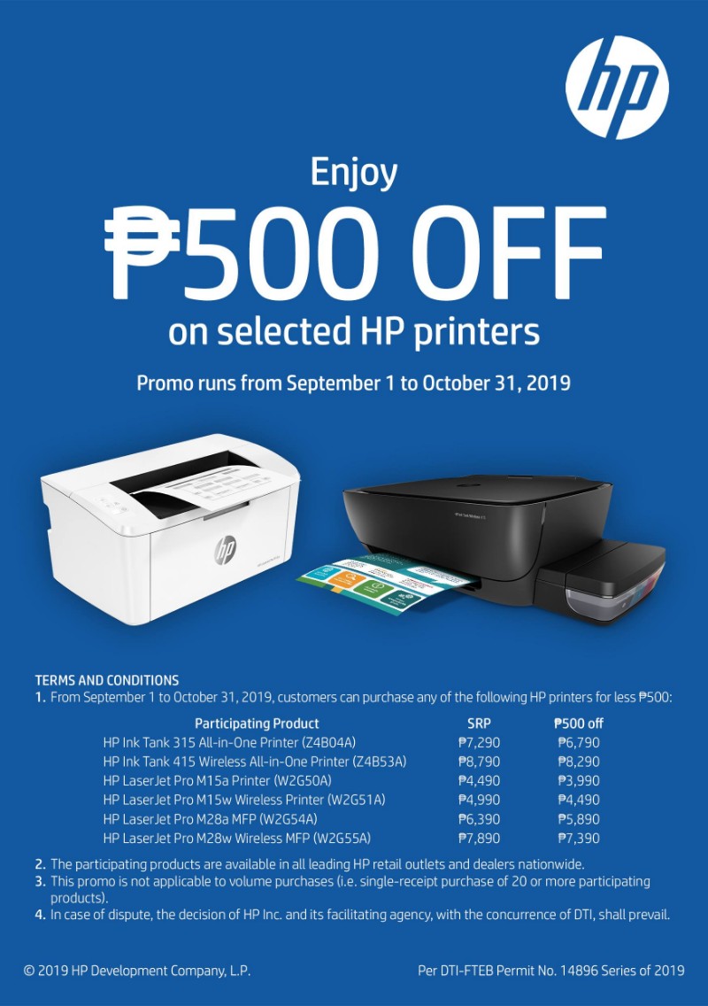 From now until October 31, 2019, every purchase of participating HP Ink Tank and LaserJet Pro printers at authorized outlets entitles buyers to a PhP 500 discount.
