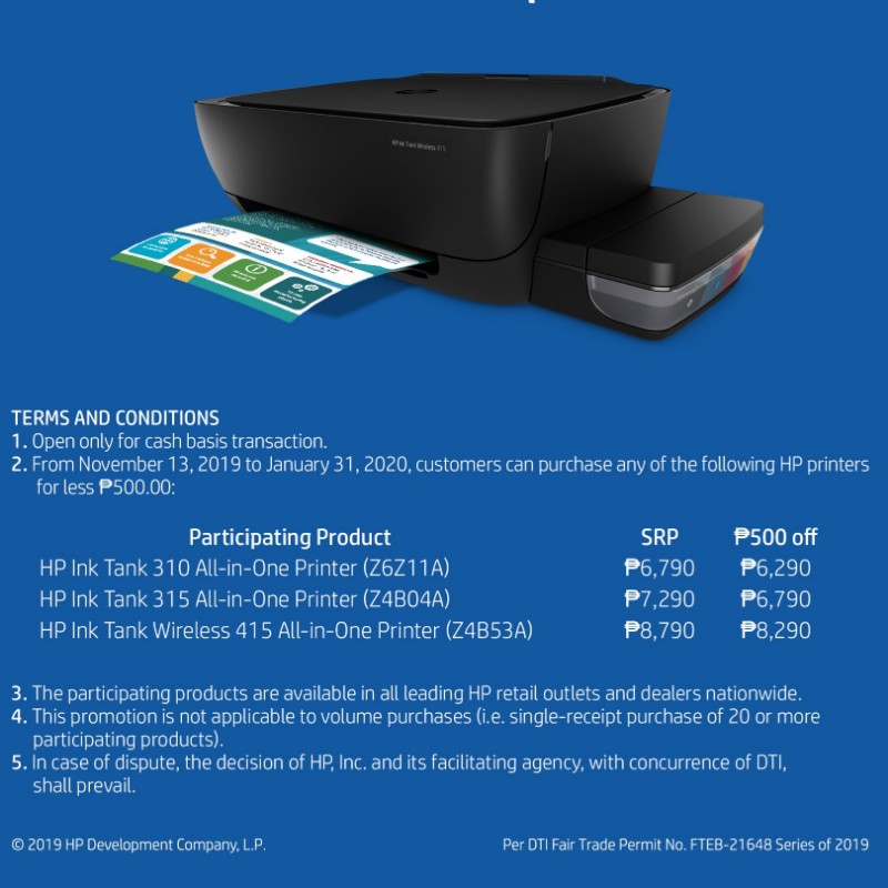 From now until January 31, 2020, the HP Ink Tank 310 All-in-One (AIO) printer will be available for only P6,290, and the HP Ink Tank 315 AIO for P6,790, while the HP Ink Tank Wireless 415 AIO printer will have a P8,290 tag price.