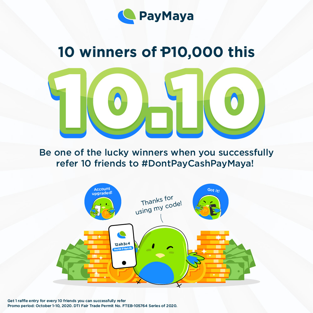 From today until 10.10 or October 10, PayMaya account holders who refer friends and family using their unique referral code can not only get a P50 reward for every referral, but they can also get a chance to be one of the 10 lucky PayMaya users who will take home P10,000 in the raffle.