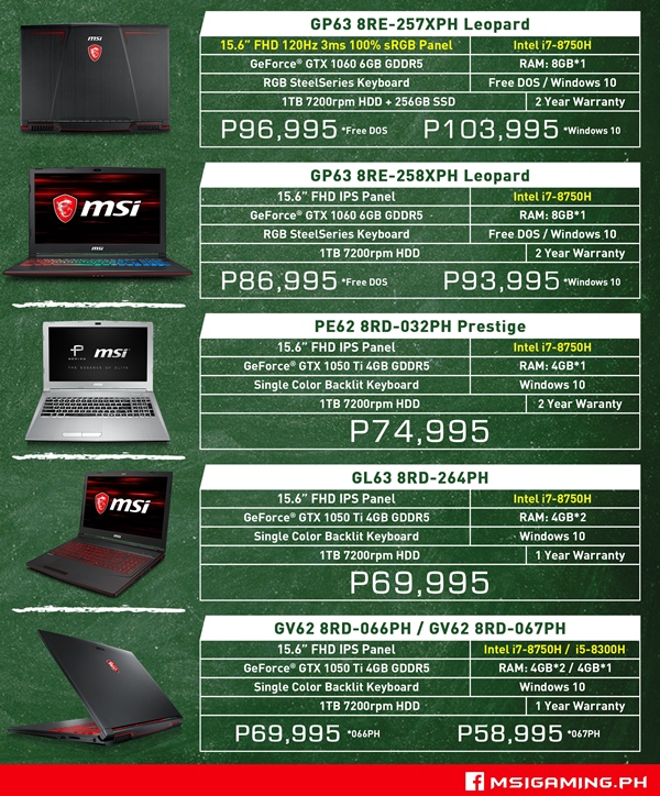 MSI's GV62 series with 8th Generation Intel Core CPUs comes with two models. The GV62 8RD-066PH is expected to carry the powerful i7-8750H, whereas we can expect the i5-8300H on its 067PH variant. While in no difference, both machines are packed with an NVIDIA GeForce GTX 1050 Ti GPU. The combination of their CPU and GPU plus the Cooler Boost 4 is nearly perfect for everyday gaming and content creation. The 066PH is priced at PhP 69,995, while the 067PH sells for PhP 58,995.