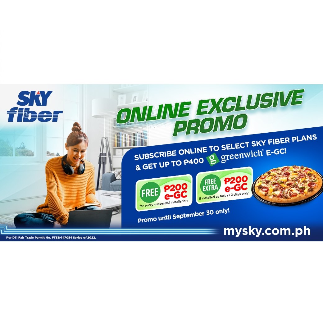When you subscribe to SKY Fiber, you can get a treat to go with your binge-watch party. All subscribers who apply online to a SKY Fiber 50Mbps Plan or higher can get up to ₱400 free Greenwich e-GCs until September 30.