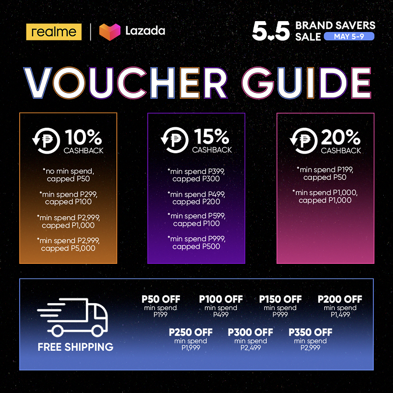 Meanwhile, on the Lazada 5.5 Brand Savers Sale, fans can score up to 75% OFF on selected realme products from May 5 to 9. Exclusive cash backs and free shipping vouchers are also available for claiming! See below for the voucher guide to help you make the most out of the sale!