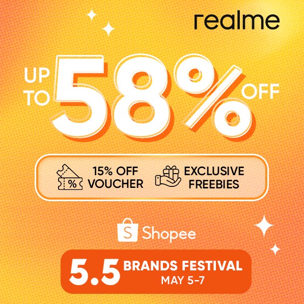 Fans are in for a treat as realme products can be scored at the Shopee 5.5 Brands Festival with up to 58% OFF from May 5 to 7. To make things even more fun during the first sale on May 5, realme will be giving away an additional 15% OFF vouchers to all customers that are redeemable upon checkout. On top of this, fans should also watch out for surprise voucher drops on selected realme products during the day!