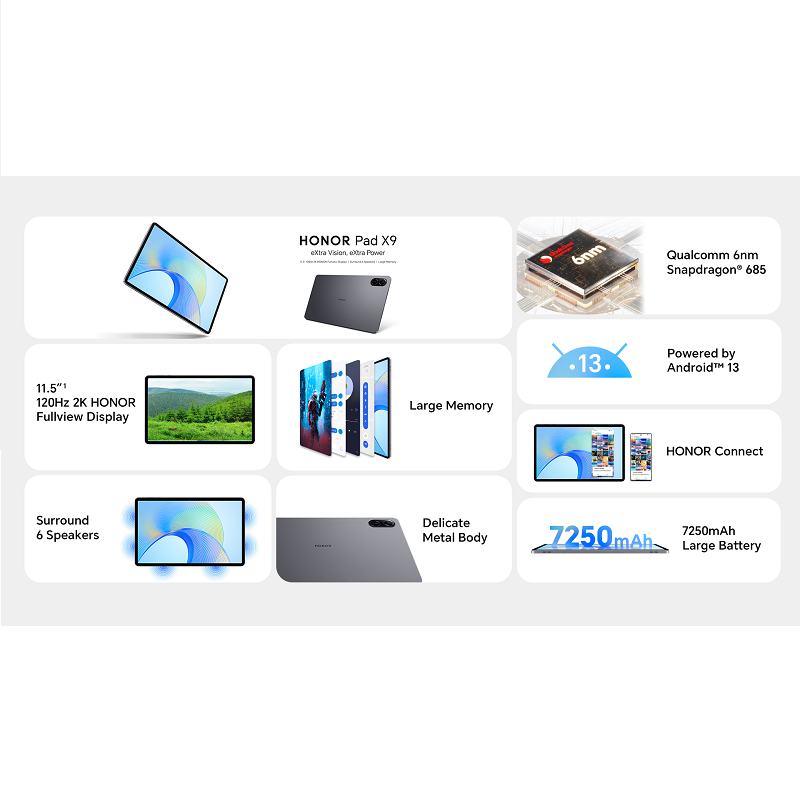Featuring 4GB memory and large 128GB storage drive, the HONOR Pad X9 can hold 26,880 pictures, 10,752 songs or 430 HD videos, providing users an ample storage for their multimedia collection. Taking full advantage of the memory, the powerful Qualcomm Snapdragon 685 4G 6nm processor guarantees fluid graphics and quick response, enabling users to manage easily even the most intensive and demanding tasks.
