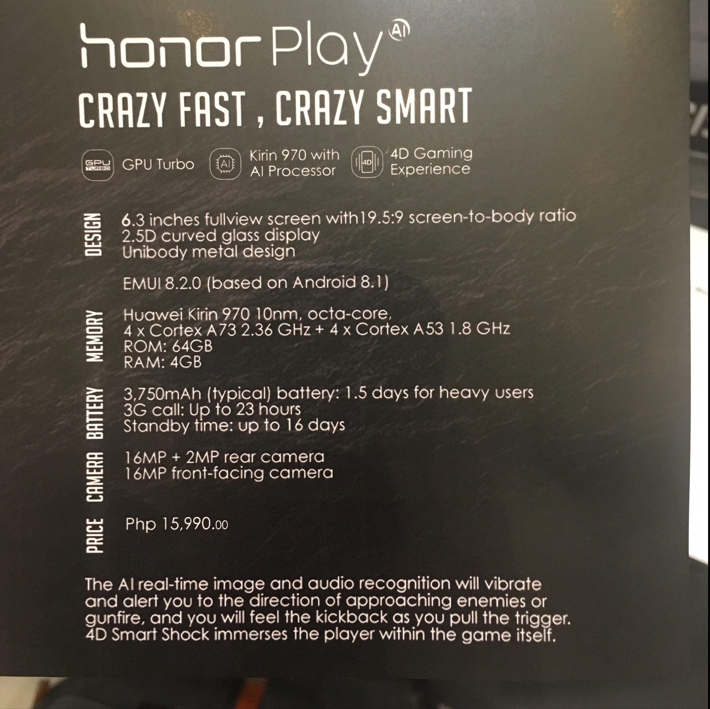 Pre-orders can be made at the Game with the Brave event - in partnership with SM Cyberzone - at SM City Fairview starting today, August 11, 2018. The Honor Play will be available on Lazada, Shopee and stores nationwide, starting August 13, 2018.