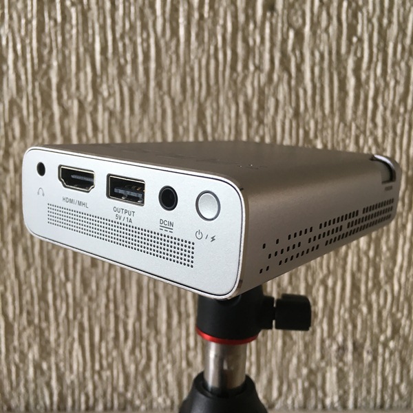 The sides are stylishly perforated for audio and heat dissipation. Meanwhile, the rear side hosts an HDMI connector, USB Type A port (5V, 1A), and a 3.5mm audio jack, alongside the DC connector and the power button. The HDMI connector links to compatible sources like computers, MHL-enabled smartphones and tablets, and media streamers. The USB connector is intended for recharging compatible mobile devices with micro-USB ports. The 3.5mm jack outputs sound to headphones and speakers. Meanwhile, apart from turning on/off the device, the power button also switches the ZenBeam E1 from being a projector to a power bank and vice versa. Aside from having a set of four rubber feet that keeps the projector stable while standing on a surface, the ZenBeam E1 also comes with a screw-in hole for tripod mounting on the bottom side.