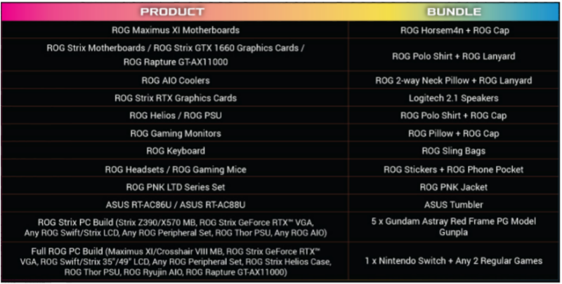 The promotion will run from until August 14, 2019. For select ROG products, gamers can get a specific ROG item or premium gaming device/accessory. For the first five ROG Strix DIY PC buyers, ROG will bundle it with a Gundam Red Astray Frame Gunpla to act as the rigs guardian. For the first complete ROG high-end buyer, ROG will reward the lucky customer with a Free Nintendo Switch with two regular titles.