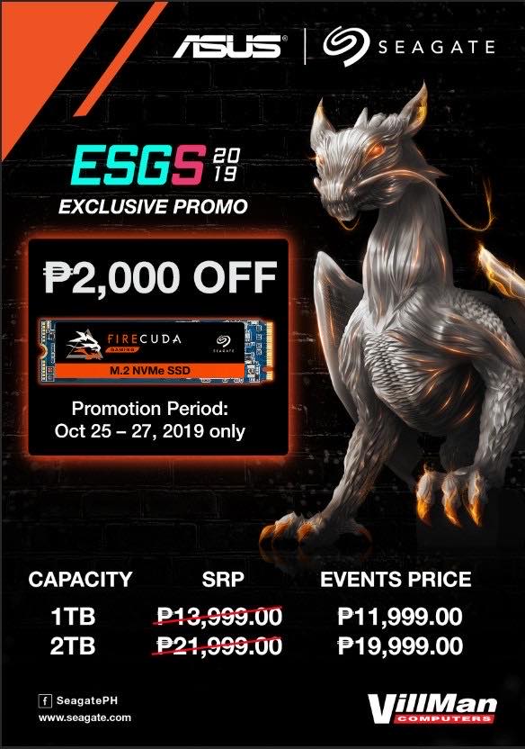 Joining ESGS 2019, Seagate, in partnership with ASUS, is offering the Seagate FireCuda Gaming M.2 NVMe SSD with a discount valued at PhP 2,000 starting from the opening of the event on October 25 (today) until the closing ceremony on October 27, 2019 (Sunday).