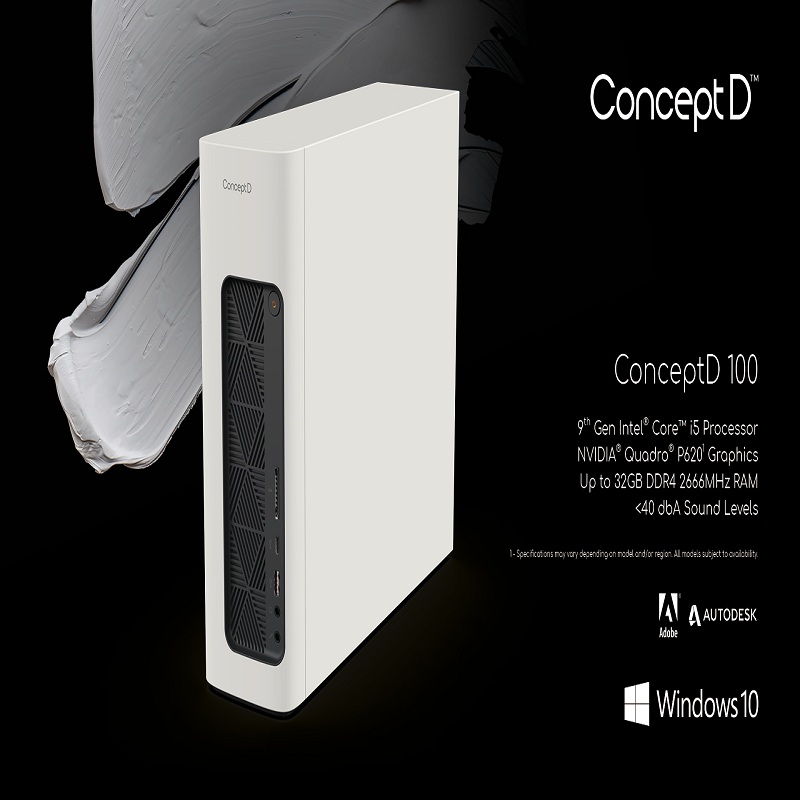 The ConceptD 100 desktop is ideal for graphics-intensive 2D design and entry-level 3D CAD modeling, addressing the specific needs of professional creators and multimedia classrooms. The ConceptD 100 desktop is equipped with a powerful 9th Gen Intel Core processor and an NVIDIA GeForce or Quadro GPU, allowing 2D and light-duty 3D creators to accelerate quickly and reliably through tasks and workflows. This small form factor PC comes with up to 256 GB of ultrafast SSD storage, all-around connectivity and 32 GB of DDR4 RAM, which allows creators to make simultaneous use of all essential applications without delay. Its front air intake and side-ventilation keep the mini workstation cool and ensure that its noise levels stay under 40 dBA, the equivalent of a library room. It blends features with style, coming in an elegant, off-white curved design that fits perfectly into any modern office or workspace.