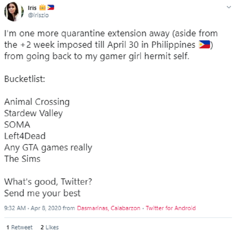 Gaming can also be an interactive way to socialize and bring people together. Filipinos on Twitter used games to create a virtual hangout spot, events venue, or to just simply collaborate with friends through quests and in-game adventures. They look for games that allow them to interact with other players such as online, social network, or multiplayer games. In April 2020, 38% of Filipino Twitter users shared that they played social games to keep in touch with their friends and family. For example, this player staged a wedding event in Animal Crossing!