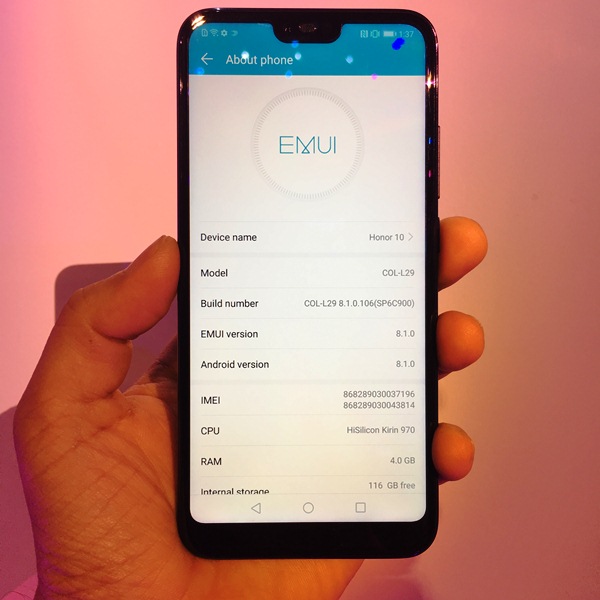At the core of the Honor 10 beats an NPU processor (HiSilicon Kirin 970) coupled with 4GB RAM and 128GB onboard storage. The handset also comes with Honor Super Charge 5V/4.5A with 3400mAh battery that can be recharged 50% within 25 minutes. The Honor 10 runs on the latest EMUI 8.2.