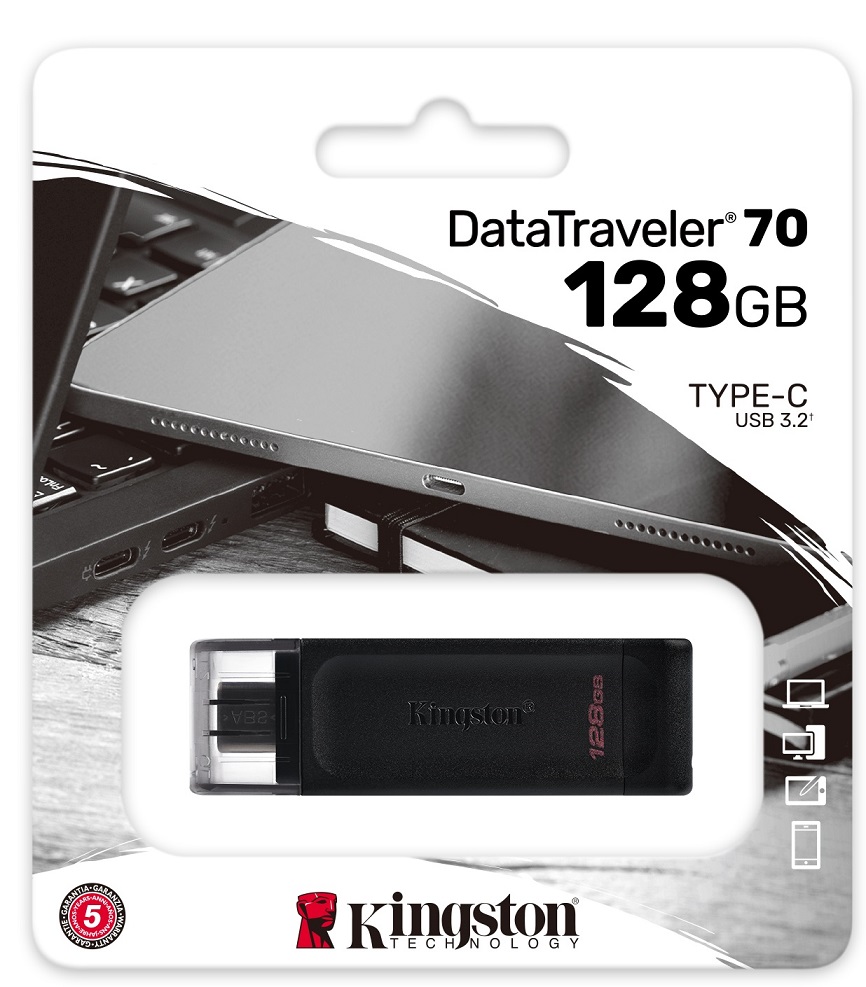 • DataTraveler 70 is a value-driven Type-C USB flash drive for compatible devices, featuring USB 3.2 Gen 1 performance (up to 10x faster than USB 2.0) and up to 128GB2 capacity. With a lightweight, portable design and high capacity to store more data, it is perfect for everyday use.