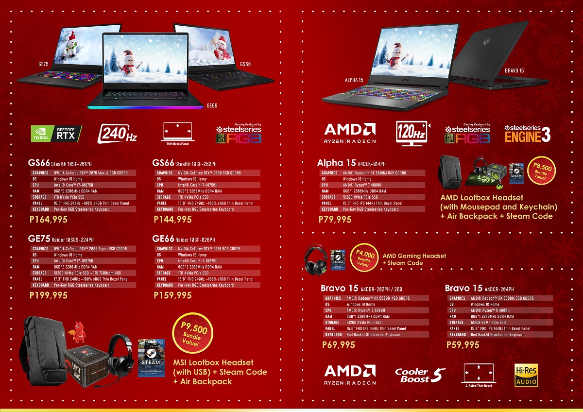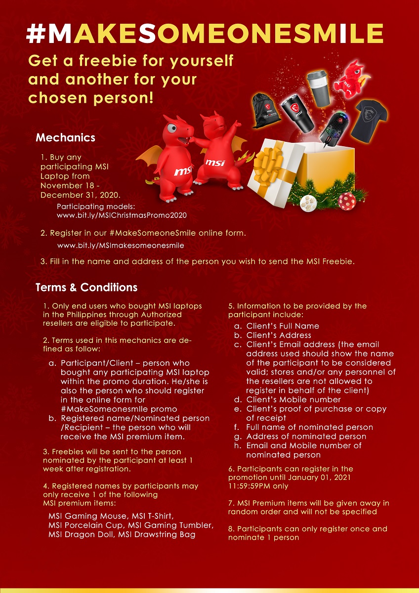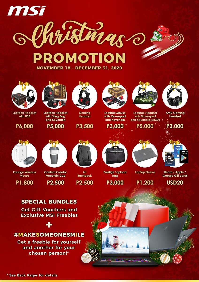 Until December 31, enjoy MSI’s Christmas Promotions 2020 and have the chance to participate in exciting programs, share your MSI experience to the community and express your love to someone through their #MakeSomeonesmIle Campaign. Don’t miss a change to collect freebie bundles, marked down items, and a brand-new laptop!