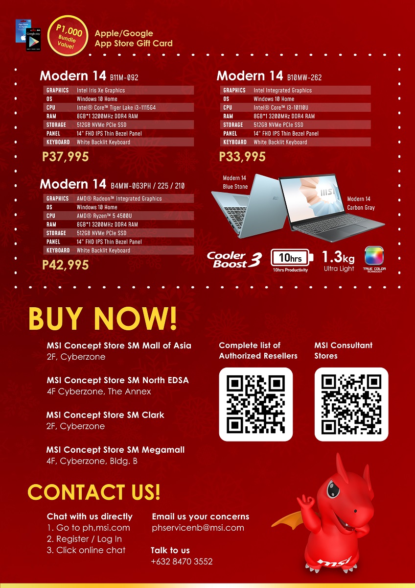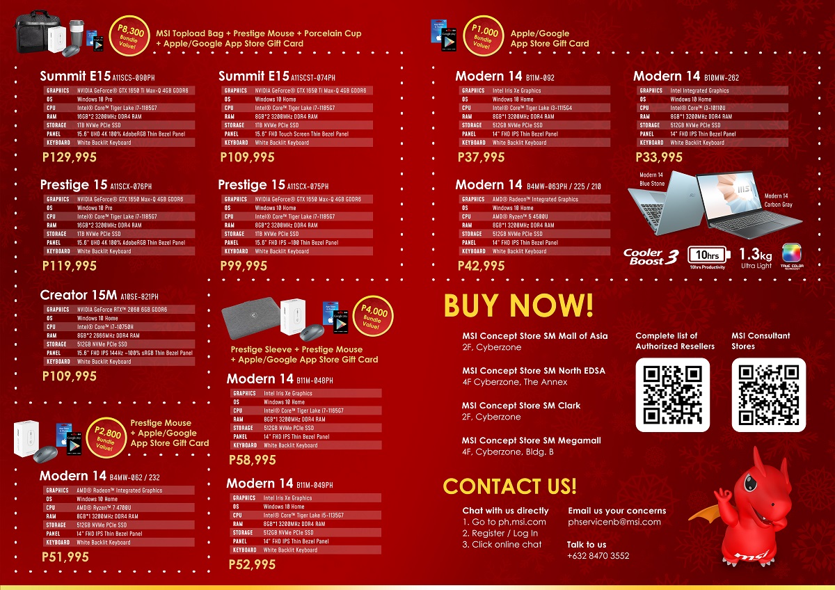 The fun does not stop there! Students, creatives, gamers, and business leaders can choose from select MSI gaming, content, and business and productivity lineup that comes with up to 9,500 pesos worth of freebies – from MSI Lootbox Headset (with USB, Sling Bag, and Keychain), MSI Topload Bag, Prestige Sleeve and Mouse to Air Backpack, Steam Code for gaming, and Apple/Google App Store Gift Cards.