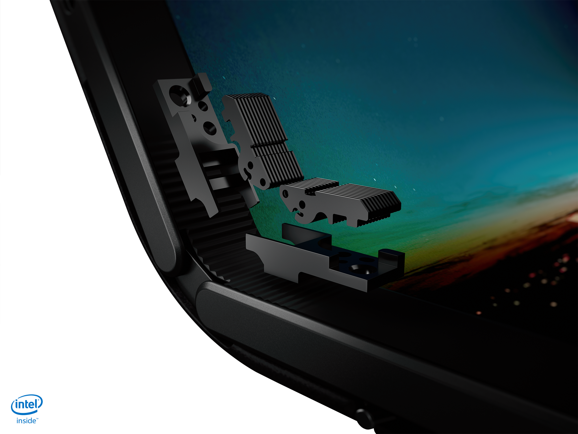 To prevent the screen from creasing or bubbling when folded for extended periods of time, multiple layers of mechanical support were built underneath the screen that provides all extra support and durability needed to be used as a main PC. The bezel of the device allows for smooth folding, as well as protection of the screen. As its protective outer shell, the X1 Fold uses Carbon Fiber hinged together to provide proper tension while folding and unfolding. To help optimize cooling, the leather folio has a foldable graphite layer that helps dissipate heat.