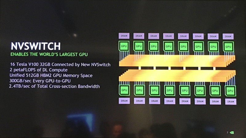 The first of these latest innovations is the NVIDIA DGX-2. Described by NVIDIA as the most powerful deep learning system, the DGX-2 consists of 16 NVIDIA Tesla V100 GPUs. One Tesla V100 boasts the capacity of 100 CPUs in a single GPU package, cramming in a total of 16GB GPU memory, 640 NVIDIA Tensor cores, and 5,120 NVIDIA CUDA cores. Do the math and you realize that the DGX-2 is a powerhouse with 512GB GPU memory, 10,240 Tensor cores, and 81,920 CUDA cores, delivering two petaFLOPS of performance – the first of its kind to achieve such a feat.