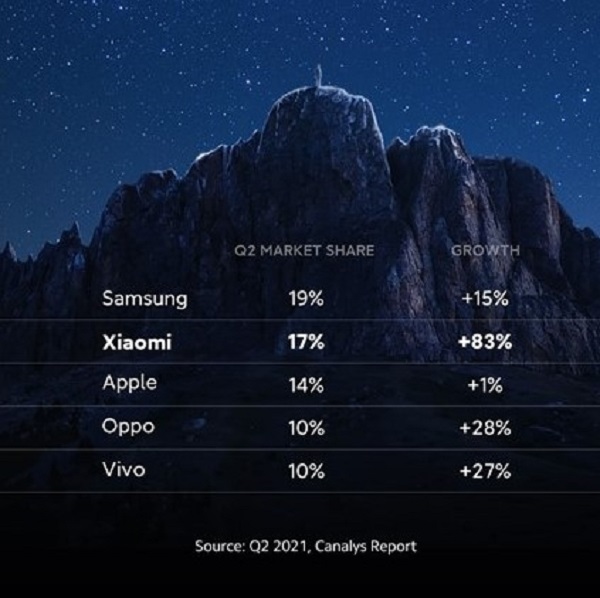Global market research firm Canalys has posted its Q2 global smartphone market report in which Xiaomi took second place with a 17 percent share and an 83 percent YoY growth, surpassing Apple.