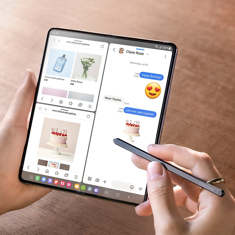 The Galaxy Z Fold has been a pioneer in transforming everyday productivity through a robust, big-screen experience, evolving from Multi Window and App Continuity to a wide range of features including Taskbar, drag and drop, and optimization of third-party apps. S Pen Fold Edition introduced in the third generation Fold in 2021, has also been fine-tuned to deliver a superior writing experience on Galaxy Z Fold5. These features and tools come together to deliver powerful productivity on a large screen and enable users to complete important tasks from anywhere.