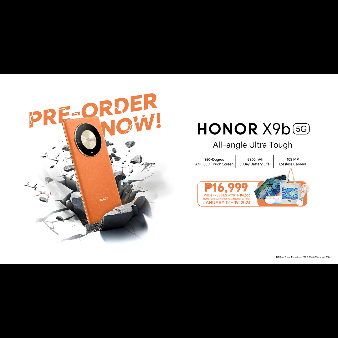 Pre-order starts from January 12 to 19, 2024 where you can get a FREE HONOR Gift Box and HONOR Choice X5 Earbuds worth Php 4,000 at select HONOR Experience and Partner Store or online via Lazada (https://bit.ly/Laz_X9b_PressRelease), Shopee (https://bit.ly/Shop_X9b_PressRelease), and TikTok Shop (https://bit.ly/TikTok_X9b_PressRelease).