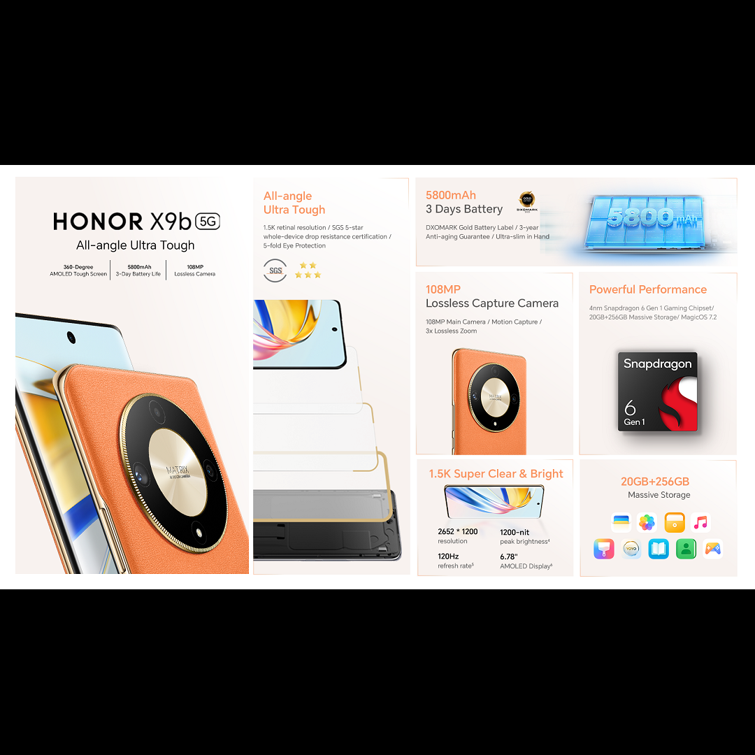 Showcasing an industry-leading drop resistance and durability, the HONOR X9b 5G’s display incorporates the HONOR Ultra-Bounce Anti-Drop technology. Certified by SGS’s Five Star Overall Drop Resistance, the HONOR Ultra-Bounce Anti-Drop Display utilizes advanced cushioning technology using newly developed materials, which increases the shock absorption capacity by up to 1.2 times, ensuring utmost durability even when subject to drops from a height of 1.5 meters and all angles.
