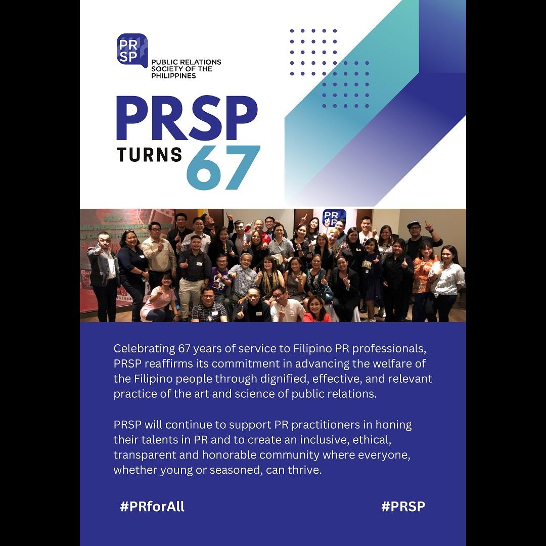 “Congratulations to PRSP for 67 years of advancing the practice of PR profession in the Philippines and for continuing to uphold the integrity and maintaining the highest ethical standards in the PR industry,” said PRSP President Andy Saracho, APR.