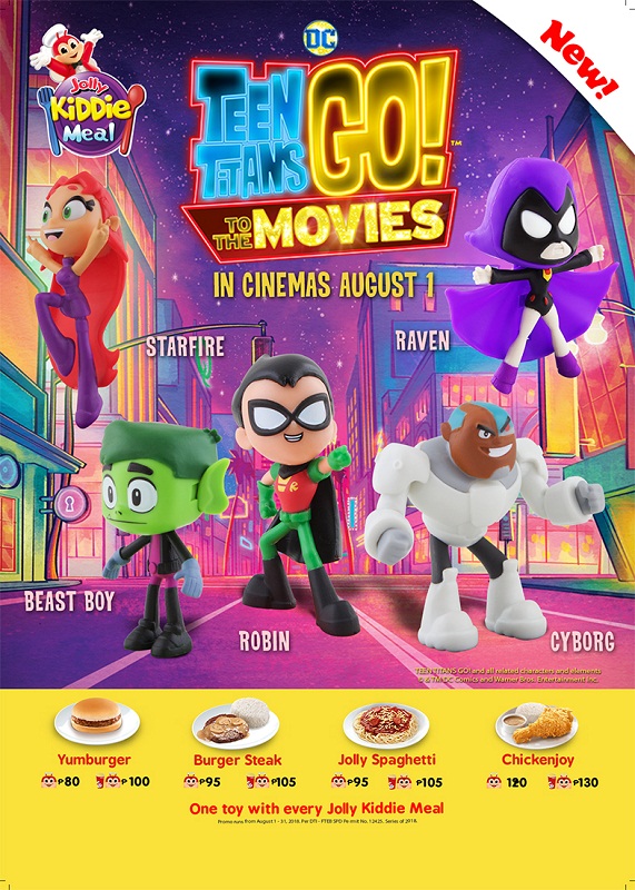 Collect all Teen Titans Go! To the Movies heroes with every purchase of a Yumburger (PhP 80), Yumburger Meal with Drink (PhP 100), Jolly Spaghetti (PhP 95), Jolly Spaghetti Meal with Drink (PhP 105), 1-piece Burger Steak (PhP 95), 1-piece Burger Steak Meal with Drink (PhP 105), 1-piece Chickenjoy with rice (PhP 120), or 1-piece Chickenjoy Meal with Drink (PhP 130), each with its own Jolly Joy Box.