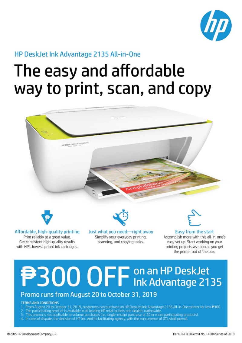 So, hurry! Get the HP DeskJet Ink Advantage 2135 All-in-One printer today to avail of the PhP 300 discount. Per DTI-FTEB permit no. 14084 series of 2019. Visit www8.hp.com or see posters and print ads for more details.