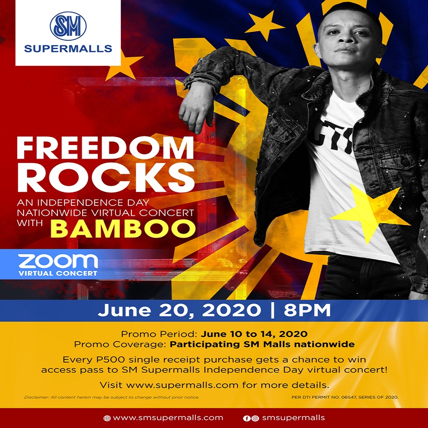 To give you some rock n’ roll at the convenience of your homes, shoppers can get a chance to watch Pinoy rock icon Bamboo via SM Supermalls’ first ever virtual concert happening on June 20 at 8pm via ZOOM. Fans can get a chance to win an exclusive pass for every single receipt purchase of P500 from June 10-14.