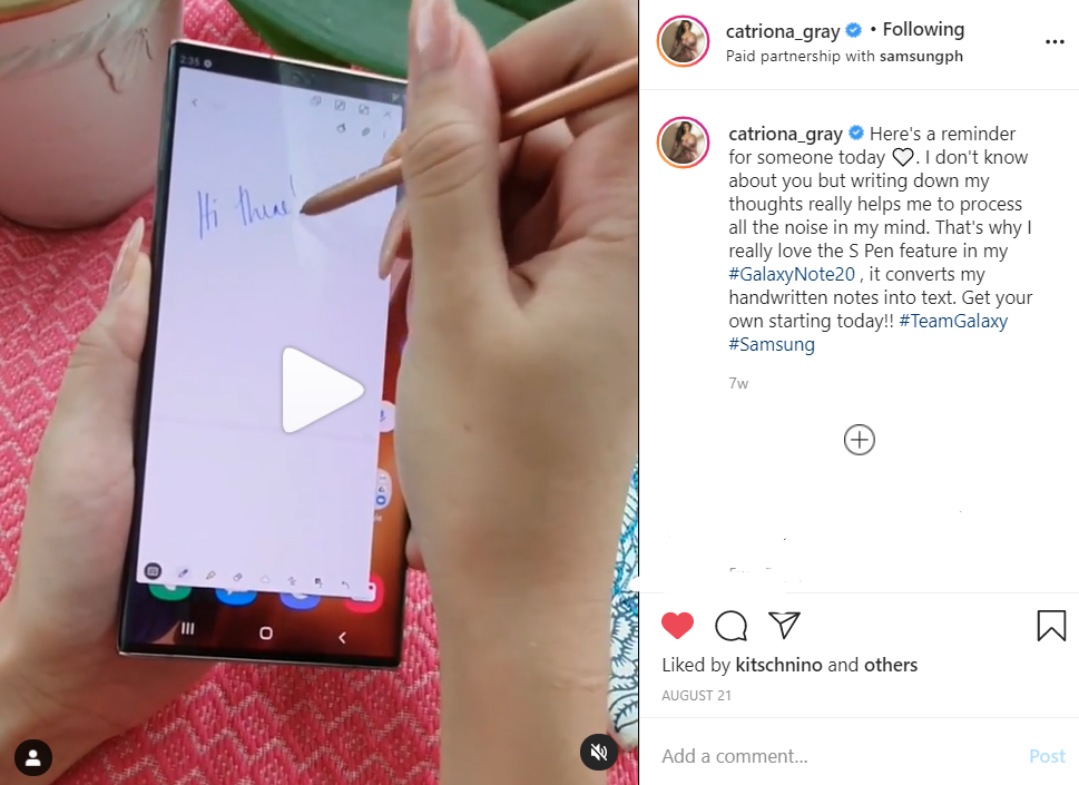 1. Quickly record and share notes to not miss important details. Having multiple meetings in a day, Catriona uses her Galaxy Note20 Ultra's Lifelike S Pen and the app Samsung Notes, which allow her to jot down minutes, convert handwritten notes into digital texts, and send it through email. The device allows her also to import PDF files or photos on Samsung Notes so she can place her comments directly. This gives her more time to focus on other tasks.