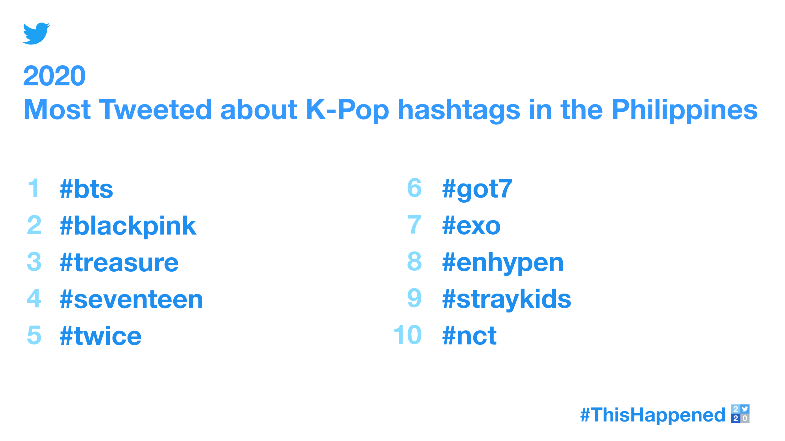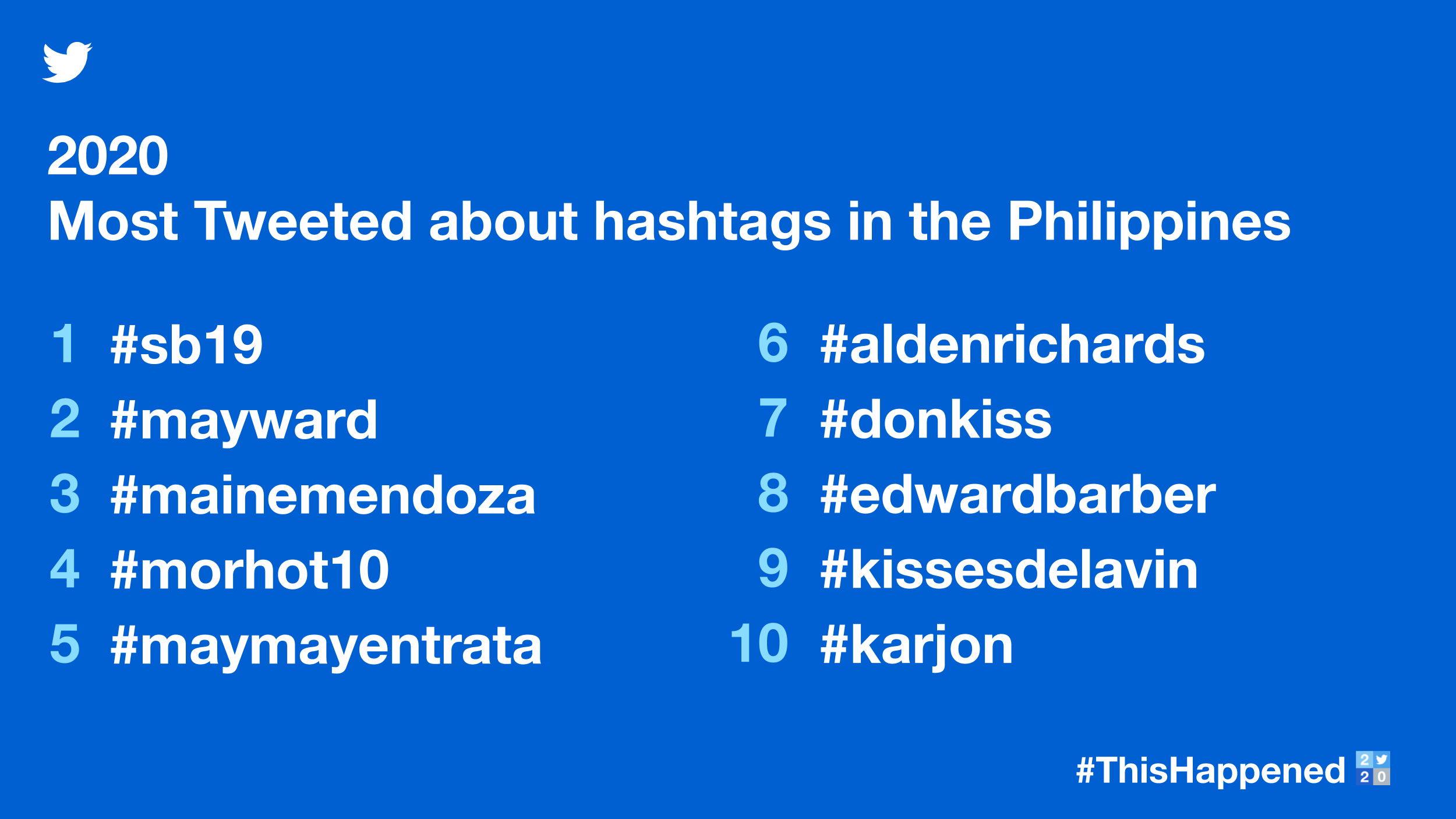 Just like last year, Entertainment proved its dominance as the Most Tweeted about hashtags this 2020. Music, loveteams, and local celebrities continue to make Filipinos smile despite the challenging times. This year, P-Pop boy group #SB19 debuted straight to the top of the list, while #MayWard, #MaineMendoza, and #AldenRichards among others continue to set the trend, thanks to the fans who unceasingly show their support on Twitter.
