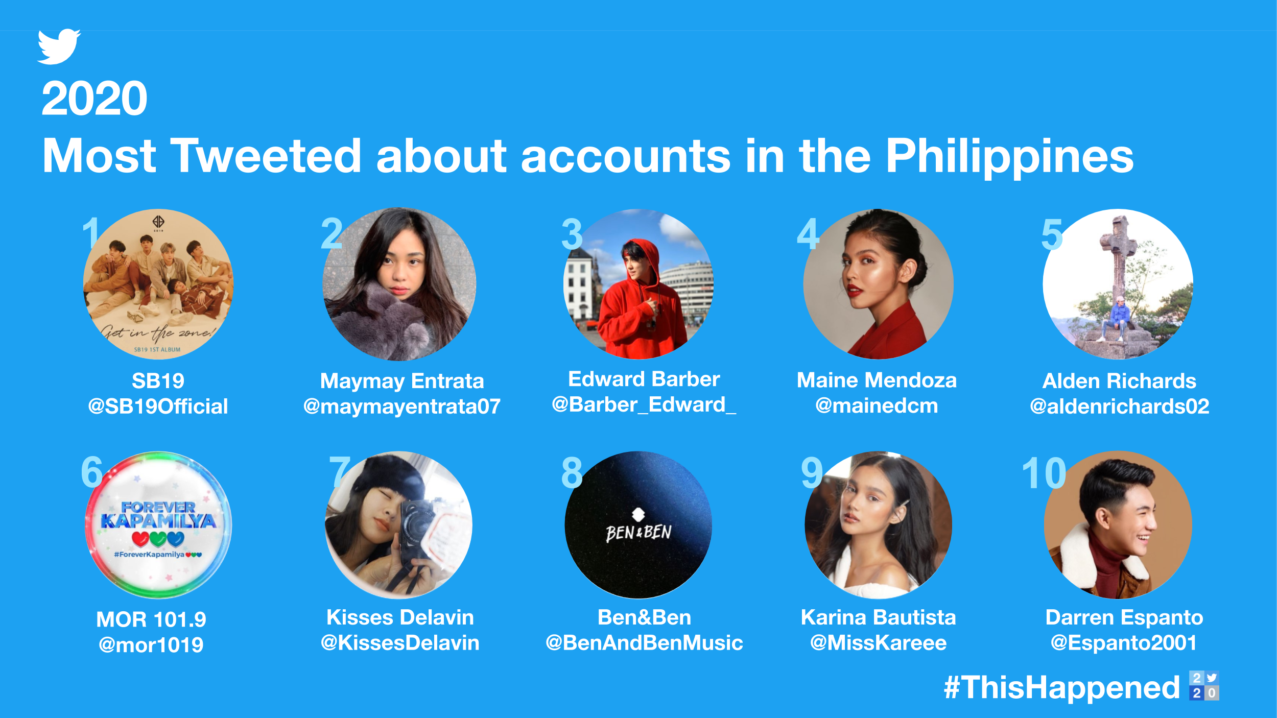 Entertainment remains steadfast on being the top conversation driver on Twitter. Perhaps, Entertainment kept Filipinos (virtually) together, and staying updated with the scene became their solace and joy in the rather mundane life at home. This year’s list of Most Tweeted about Accounts is led by the phenomenal group, SB19 (@SB19Official), who went straight to number 1; while other “veterans” such as Maymay Entrata (@maymayentrata07), Edward Barber (@Barber_Edward_), Maine Mendoza (@mainedcm), and Alden Richards (@aldenrichards02) completed the top half of the list.