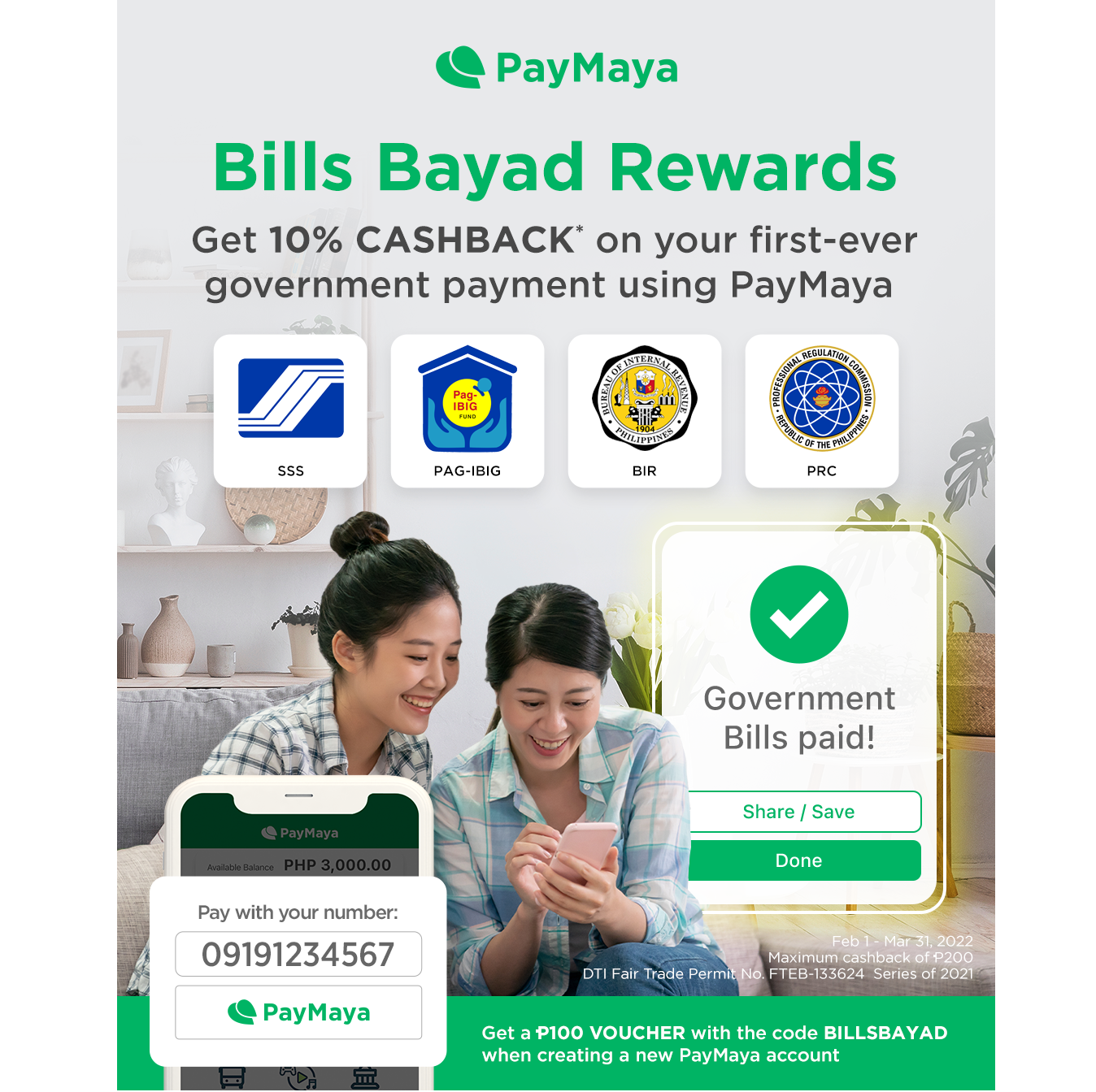 PayMaya is bringing Filipinos the convenience, safety, and time-saving benefits of paying for their fees and dues to the Social Security System (SSS), the Home Development Mutual Fund (Pag-IBIG Fund), the Professional Regulation Commission (PRC), and the Bureau of Internal Revenue (BIR) with the Bills Bayad Promo.