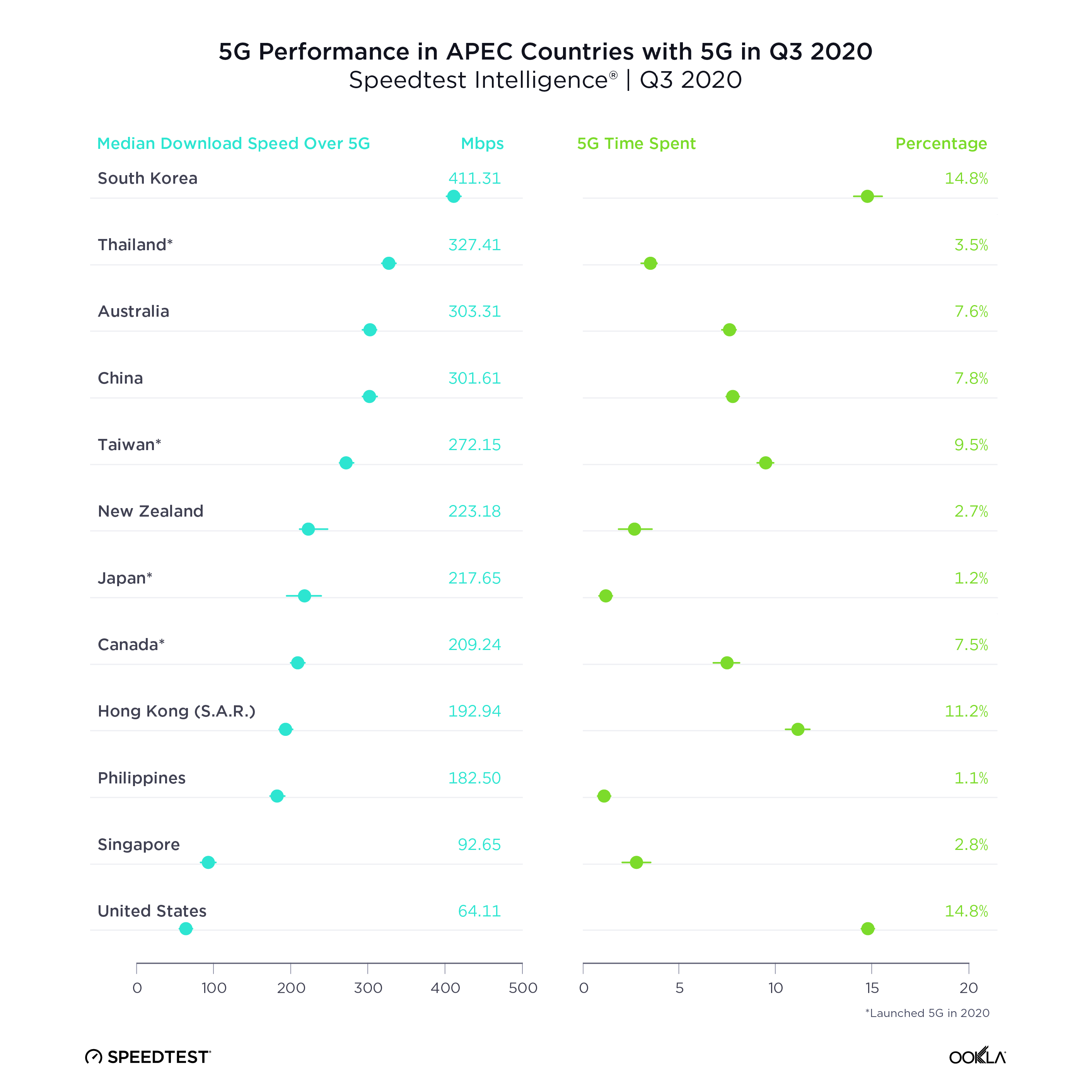 The Philippines ranks 10th among APEC countries with median download speed on 5G at 182.50 Mbps based on Ookla Speedtest Intelligence® Q3 2020 data[1]. Median 5G download speed is the aggregate speed measured in the 50th percentile of all tests taken with Speedtests on a 5G connection. This is a huge feat for an emerging market economy aiming to have a #1stWorldNetwork infrastructure. Globe has been a steady supporter of the government's initiative to improve the country's state of connectivity. The telco has led the industry in new site builds last year and strengthened its network with extensive 4G LTE and 5G upgrades. These sustained and vigorous efforts have resulted in improved internet speeds and higher Consistency Scores as confirmed by various independent analytics firms. According to Ookla Speedtest Intelligence, the worldwide median download speed over 5G was 954% faster than 4G in Q3 2020. In Q3 2020 alone, there were 4,324,788 Speedtest results over 5G[2]. The telco wa
