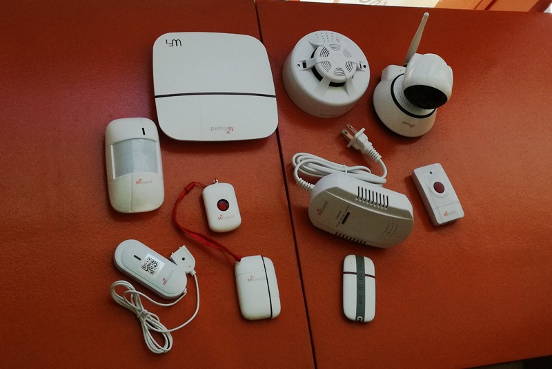 MiGuard's catalog of life-saving devices include: MiGuard Console, Wireless HD Camera, HD IP Camera, Door and Window Sensors, PIR Motion Sensors, Smoke Detector, Gas Leak Detector, Water Leak Detector, Medical Button, and SOS/Emergency Button.