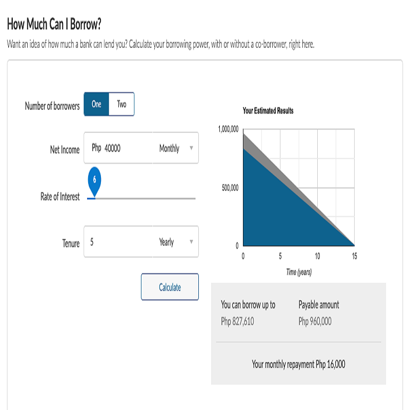 The Nook website lets you calculate your borrowing power based on your net income, rate of interest, and tenure