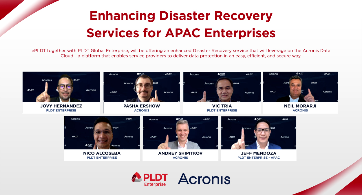“Part of our mission is to innovate and co-innovate with partners in support of our thrust which is to simplify the complex for our customers. We are pleased to partner with Acronis for us to truly deliver solutions of real value to the market and we are sure that our combined expertise in DR systems will enable enterprises to work with ease of mind and confidence,” said Jovy Hernandez, ePLDT President & CEO and SVP & Head for PLDT and Smart Enterprise Business Groups.