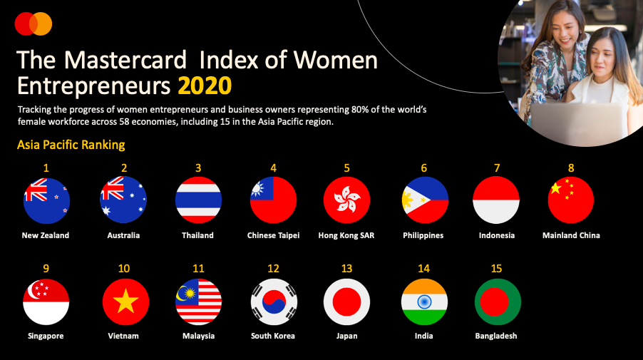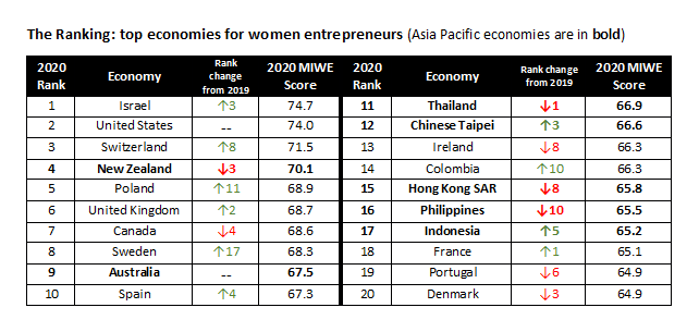 New Zealand, Australia, Thailand, Chinese Taipei, Hong Kong SAR, Philippines and Indonesia make the list of the top 20 economies globally offering the most supportive entrepreneurial conditions for women