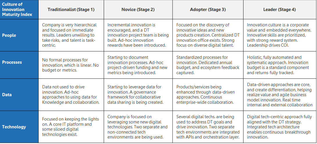 The study introduced the culture of innovation framework, which captures organizations’ approach to innovation. Through the research, organizations’ maturity was mapped against four dimensions - people, processes, data and technology. As a result, organizations were grouped in four stages – traditionalist (stage 1), novice (stage 2), adaptor (stage 3) and leaders (stage 4). Leaders comprise of organizations that are the most mature in building a culture of innovation.