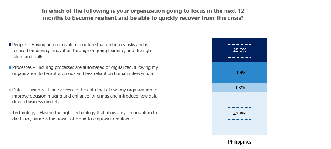 Moving forward, to ensure resilience and performance, organizations in the Philippines say they will prioritize introducing remote work in the new norm and develop a contingency plan to mitigate future risk. Asia Pacific leaders plan to focus on investing in technology infrastructure that is robust and allows scalability and flexibility.