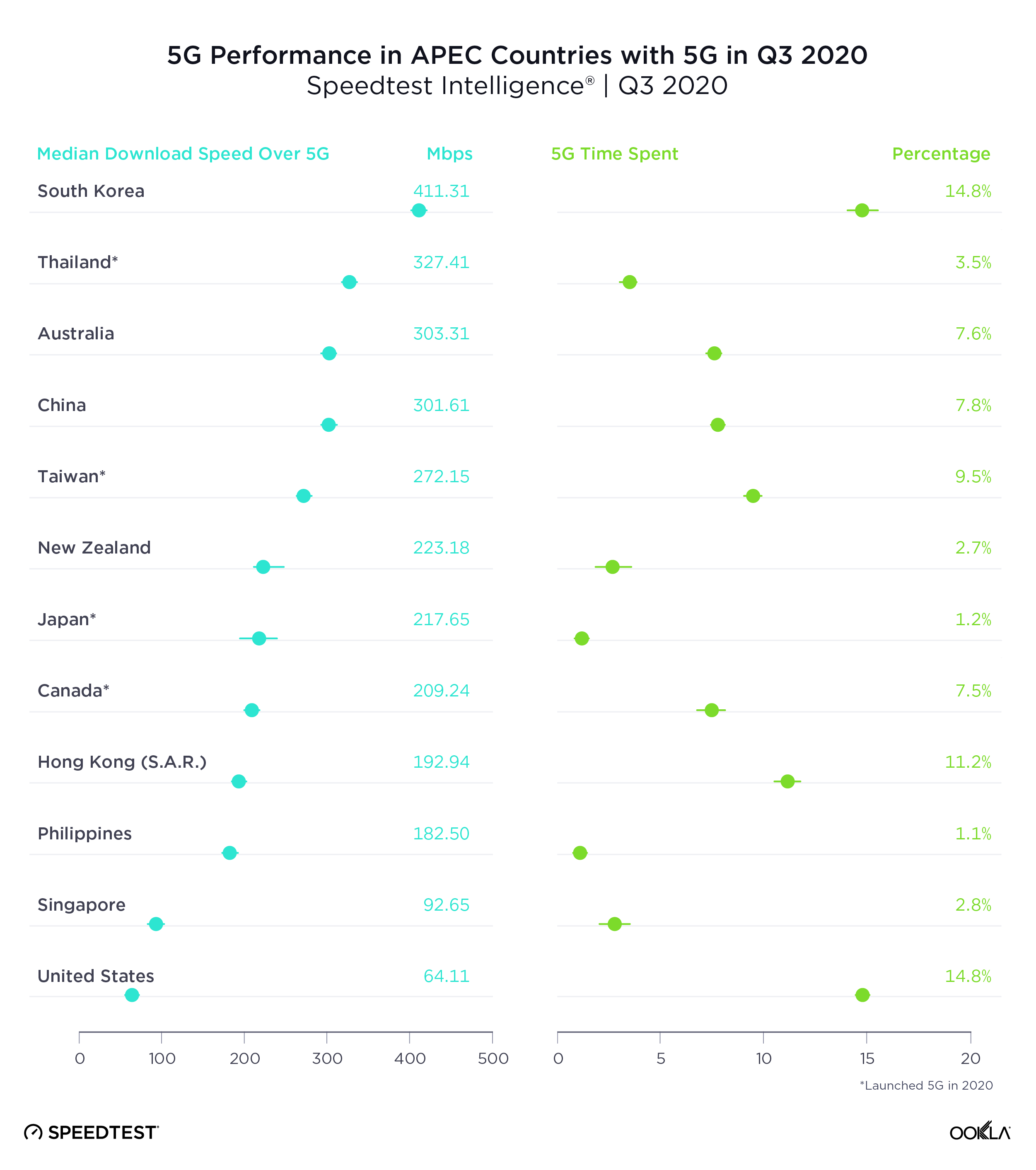 The Philippines ranks 10th among APEC countries with median download speed on 5G at 182.50 Mbps based on Ookla Speedtest Intelligence® Q3 2020 data[1].