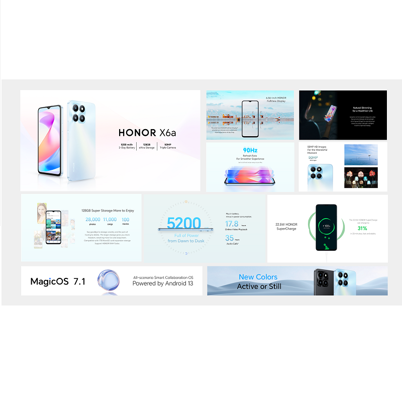Featuring a stunning 6.56-inch display supporting Dynamic Dimming, a powerful 50MP Triple Camera system, a long-lasting 5,200mAh battery and up to 128GB storage, the new HONOR X6a offers a well-rounded user experience that lasts all day long. Get it at your nearest HONOR Experience and Partner Stores or online via Lazada, Shopee, and TikTok Shop.